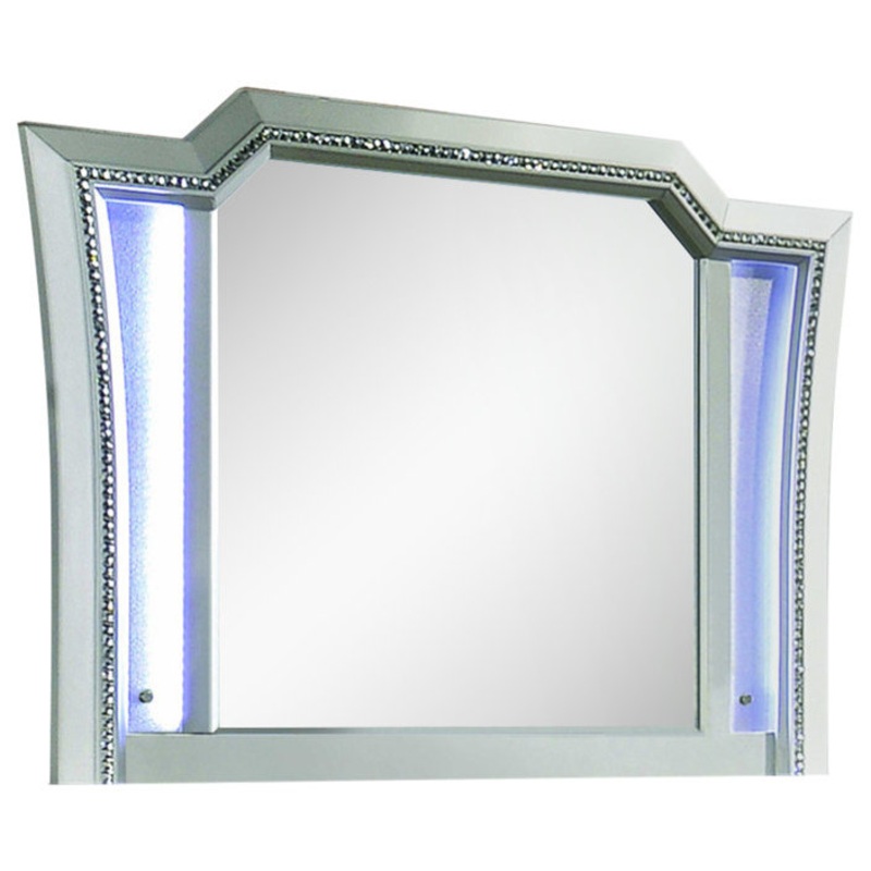 This mirror provides a commanding presence in any room. Crafted with a transitional look that is an ideal addition to any bedroom, the mirror is accented with LED light and a crystal-like sparkling trim. Its crystal-like trimming creates dazzling glow for