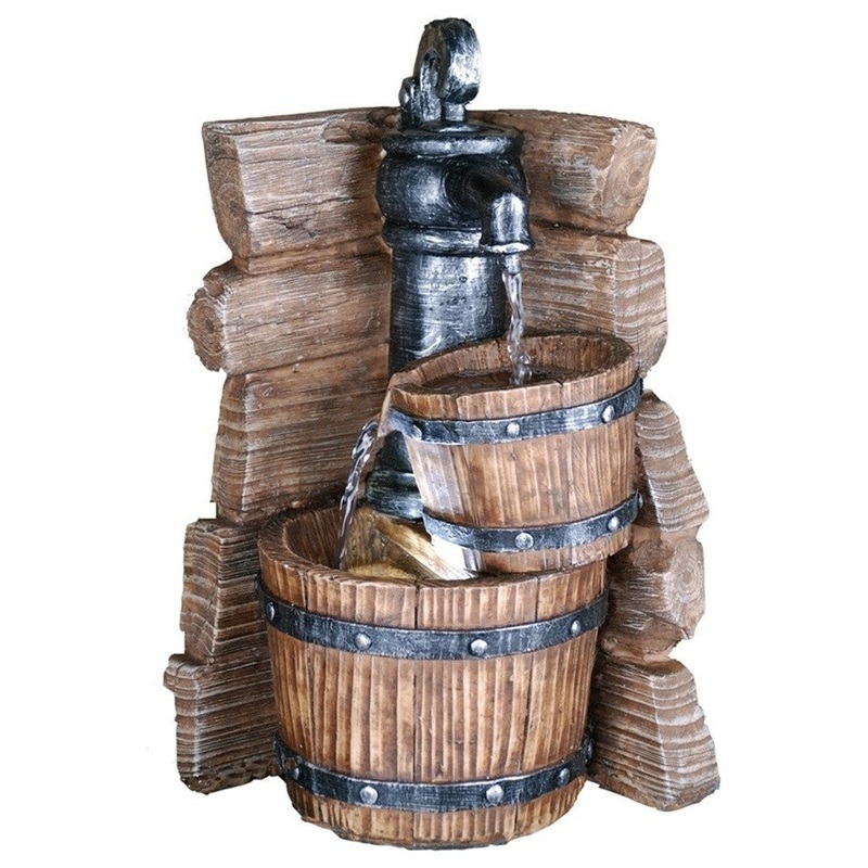 -This lovely fountain features two barrels and a water pump -The sound of the water cascading down creates a soothing and comfortable sensation -It also contains pebble stones to be placed in the fountain -Contains LED -Made of Polyresin -Use a damp cloth