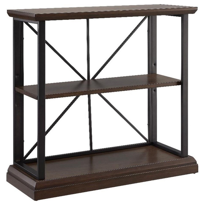 Stylish matte black painted metal and solid dark brown-finished wood combine in this beautiful bookshelf. The crossing metal design elements create a gorgeous backdrop and display for your books and decorative elements. The efficient size makes this bookcase a perfect piece for your apartment or other smaller space, but with three full shelf surfaces to accommodate all your storage needs.