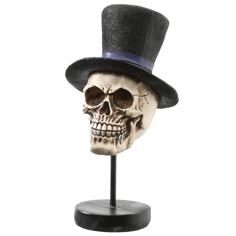 - Halloween themed decorative statue depicting a grinning skull in a black top hat with a purple ribbon around the base.