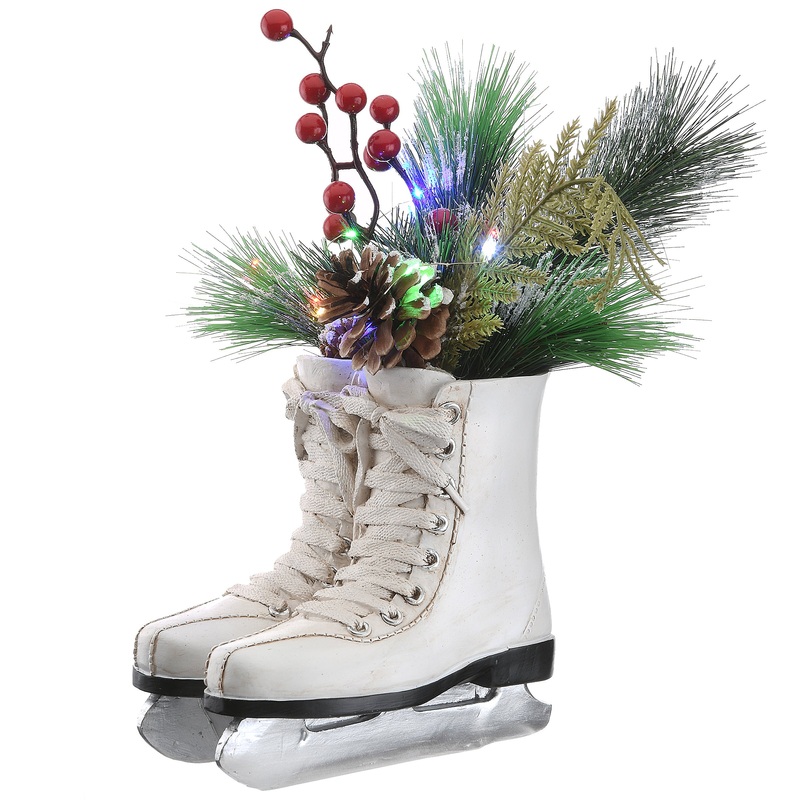 This interesting and attractive holiday decoration is constructed of sturdy polyresin material featuring detailed sculpting. Silver skate blades prop up white laced boots that contain a spray of artificial evergreen tips trimmed with red berries and pinecones. It is lit with eight battery operated multicolor lights that add a colorful glow. A 6 hours ON/6 hours OFF timer is included. This tabletop piece will be a fun and unique addition to your holiday decorating scheme.