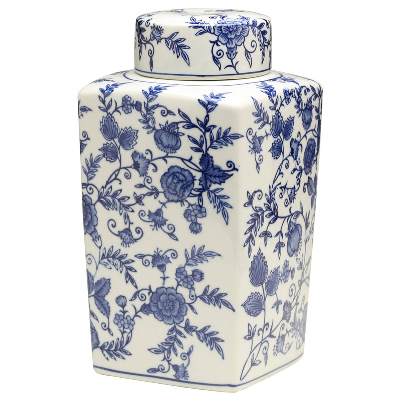 Blue and white transferware porcelain with flower and leaf design. lid is removable Model # (MPN)59950Product ID119844631Manufactured ByOrchard Creek DesignsSold ByHouzzSize/WeightW 6.75" / D 6.75" / H 12.25" / 7 lb.MaterialsPorcelainAssembly RequiredNoCat