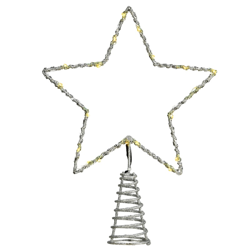 The Silver Glitter Star Tree Topper with Dual Color LED lights is for use ONLY with National Tree Company brand artificial trees that are pre-lit with Dual Color LED lights AND includes the extra end connector in the tree top section. This tree top star decoration changes color in unison with the lights on the tree that creates a stunning visual effect. Its silver finish will add a sleek, modern touch to your tree, while the color-changing feature enhances the overall ambiance.