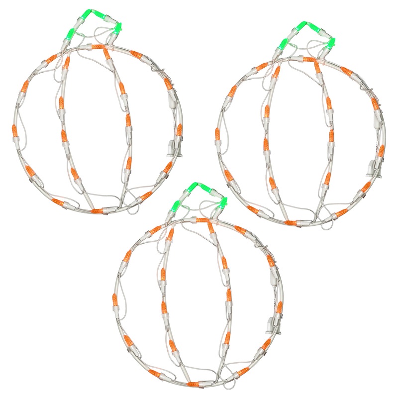 - The decoration depicts a frame shaped in the outline of round pumpkins. The lights attached glow brightly in a combination of orange and green bulbs. To power the lights, simply plug into the nearest wall outlet