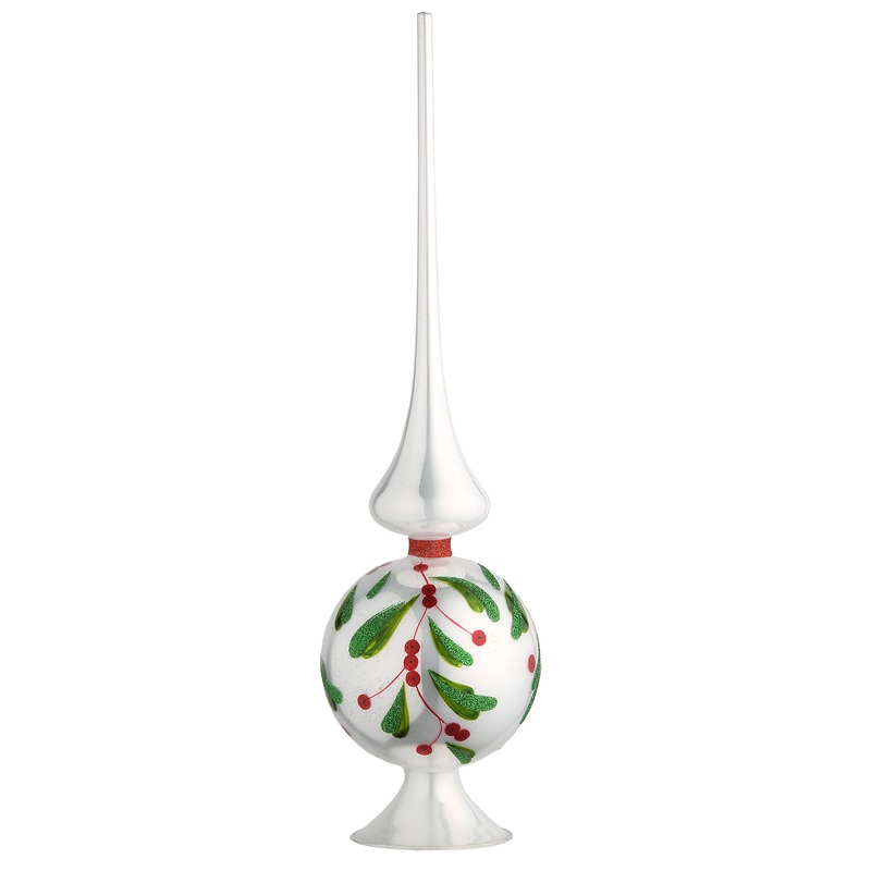 The Holly Leaves Glass Christmas Tree Topper ornament features the classic ball and spire styling designed to complete your tree decorating. A motif of green holly leaves and red berries are hand painted on the ball. The glass design adds an elegant touch,