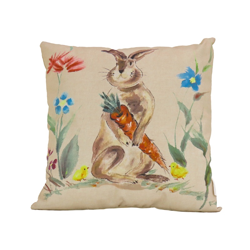- This decorative pillow is decorated with an Easter-themed, color printed design featuring an artistically rendered bunny holding his carrot trophy and a surrounding scene adorned with pastel colored long stem flowers and two bright yellow chicks