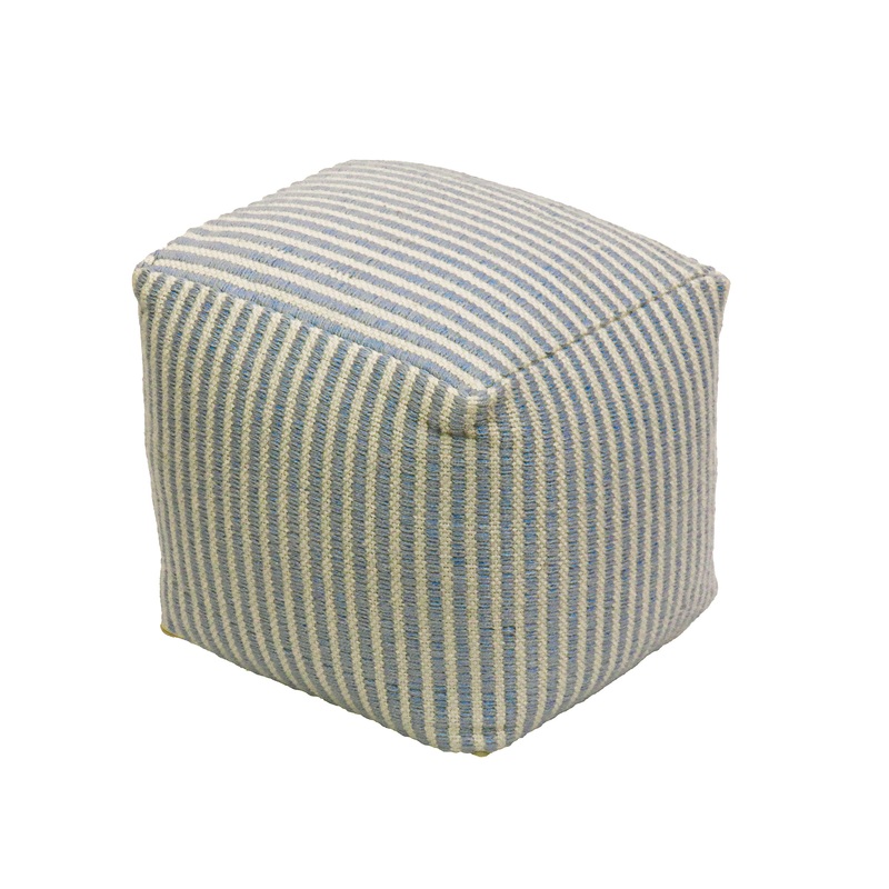 Convenient, comfortable, and stylish, this pouf ottoman is a multipurpose furniture piece offering uses as a portable seat, footrest, or tabletop. Soft yet solid, it is constructed with a polystyrene bean fill and features a strong hand-woven sustainable polyester cover designed to endure outdoor environments. Dress up an interior or exterior space with this versatile pouf featuring a striped pattern in icy blue color, an accent piece that offers both form and function.