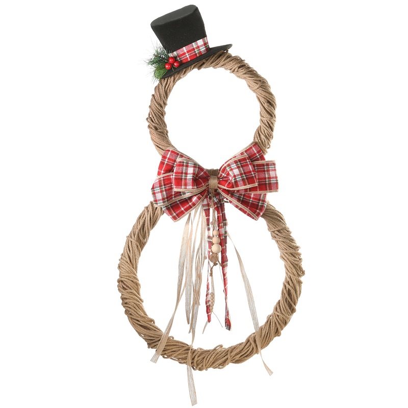- This fantastically festive wall decoration features two rings in the shape of a snowman, wound with thick brown jute rope, decorated with a black top hat, beaded ribbons and cords, and a red and white plaid bow
