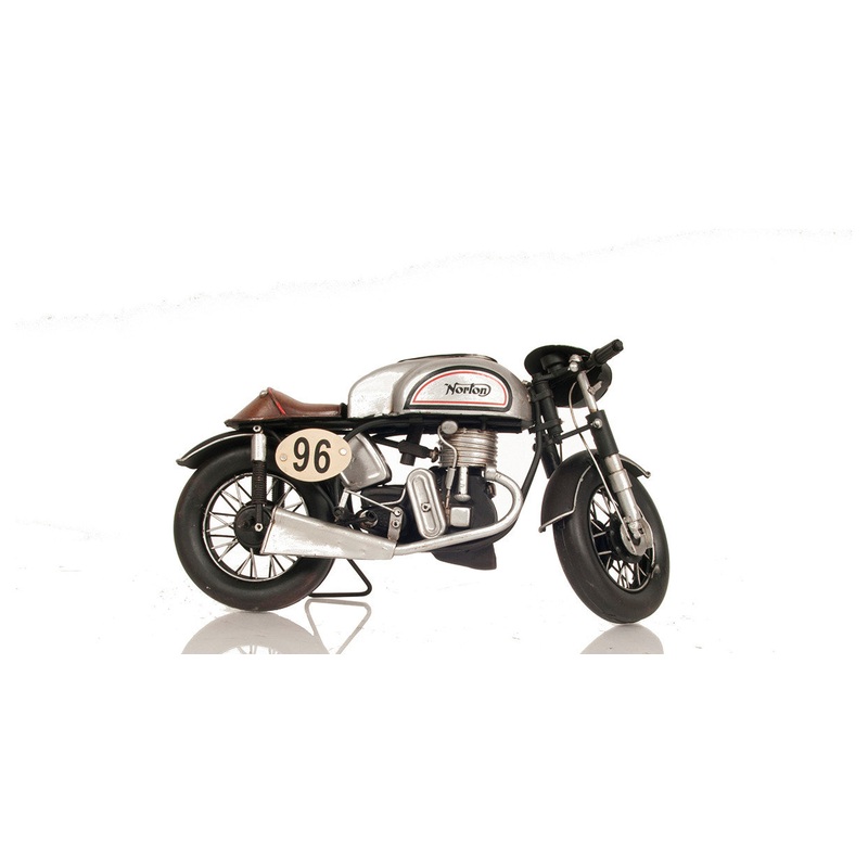 The Norton Manx or Manx Norton is a British racing motorcycle that was made from 1947 to 1962 by Norton Motors Ltd. It had contested every Isle of Man TT race from the inaugural 1907 event through into the 1970s, a feat unrivaled by any other manufacturer, and the development and honing of the Manx racing motorcycle was another step in this racing achievement. Our 1952 Norton Manx model is handcrafted of tin. It is painted silver and has a scale of 1:8. It features intricate details such as mesh wheels, 500cc engine, seat, lightweight frame, exhaust, front and side license plate with number 96, fenders, and a brake lever. Bring home and display this iconic British bike from the height of Nortons dominance of open road-racing in the 1950s. Beautiful and brutal, the Norton Manx is a true motorcycling legend. A must-have for the collector and enthusiast!