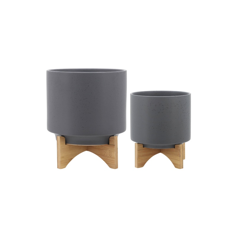 2-Piece Set Planter With Wood Stand, Matte Gray, Each LengthEach WidthEach Height – Transitional – Indoor Pots And Planters – by Sagebrook Home