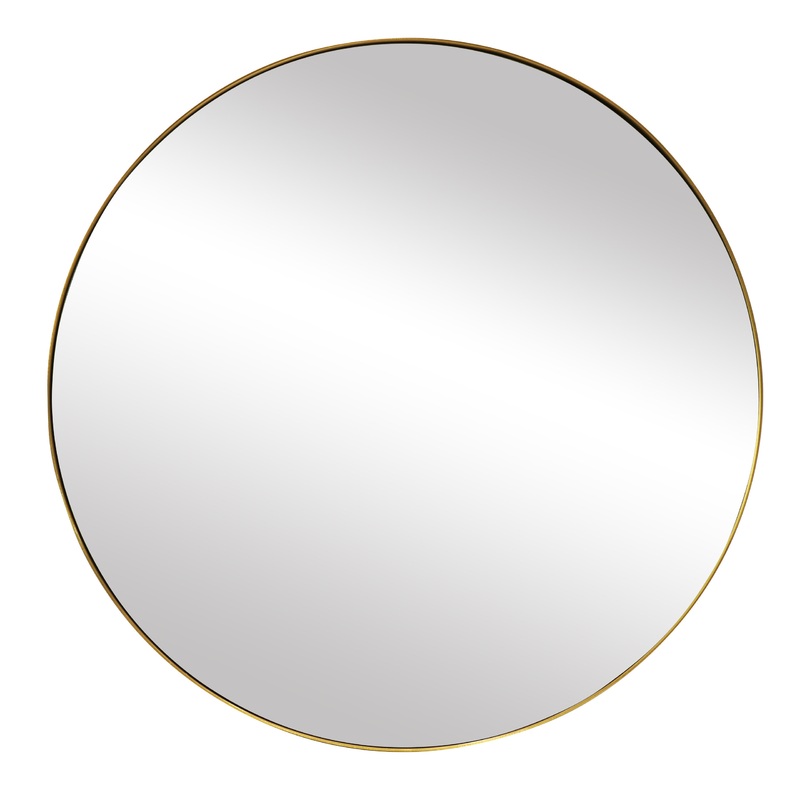 Premium Modern Round Mirror in Gold Stainless Steel Finish, 0.75″ depth. Outer Size: 20 inches dia.. HD Clarity Seek Glass. Premium and Durable Materials. Made in China. Comes ready to hang.