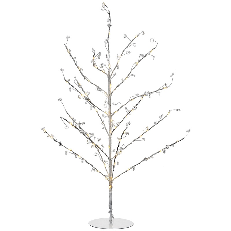 - Includes one white Metal Wire with Clear Beads artificial tree pre-strung with 70 warm white colored LED lights – to power the lights, place 3 AA batteries into the battery pack