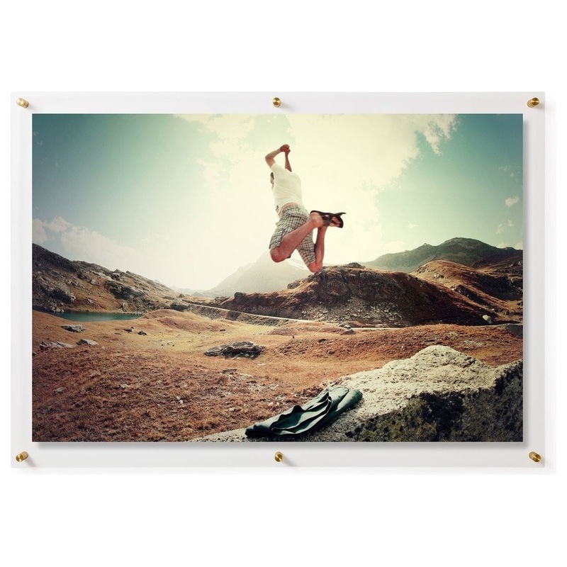 Bring your framing game to the next level with these stunning acrylic floating frames with gorgeous metal hardware. Two panels of floating acrylic "sandwich" your art for a border-less presentation. Frameless frames (also known as lucite or plexiglass fram