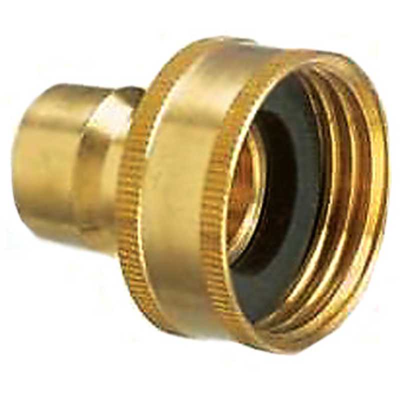 Snap fitting male end only. Fits 3/4" female hose thread. Made of brass. Carded.