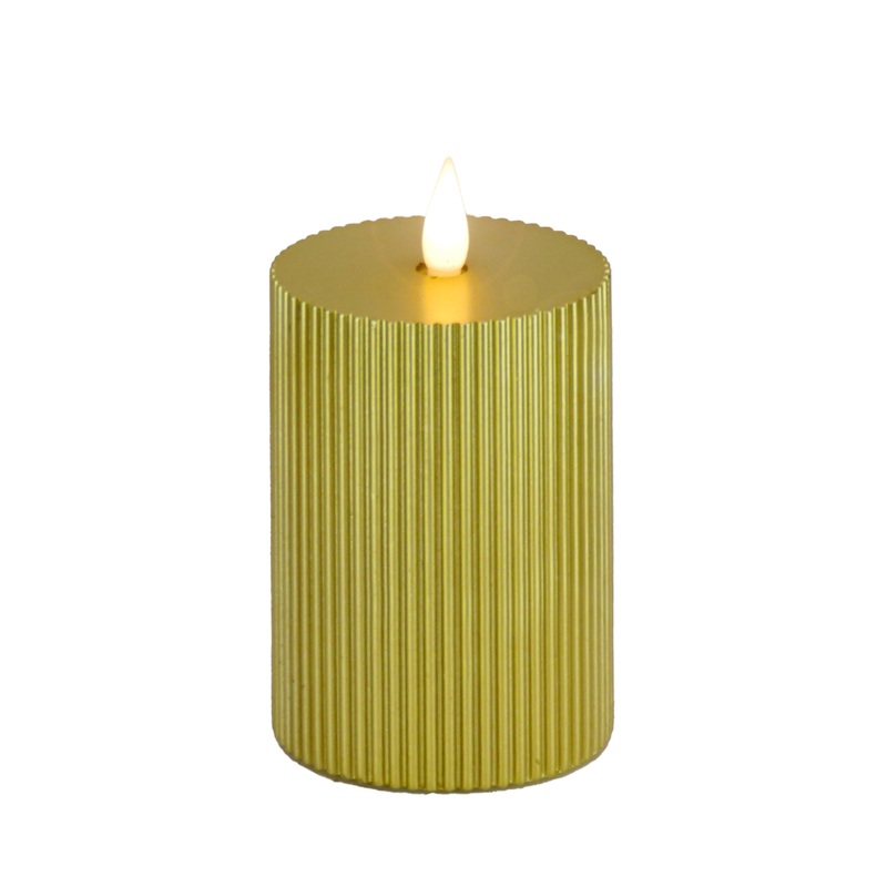 Battery operated with remote controlled functions, this flameless candle produces a realistic, soft, and safe candle glow. The exterior surface is crafted with real wax and features an elegant vertical ridged design in an attractive gold finish. A handheld