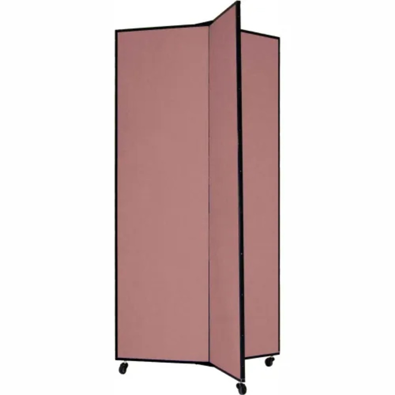 Simply move, unlock and unfold partition to provide a full, extra large display area for various environments. Accepts push pins, tacks, staples and more with ease (not included). Made using 76% recycled material. This partition features sound absorbing fabric upholstery that provides a tackable surface. The panels are finished with 20 gauge powder coated steel trim covering 26 gauge galvanized steel framing. Panels are constructed of 1/2″ closed cell honeycomb core with non-woven fiberglass facing and matte. Panels are joined with full length piano hinges and position control pivot-point hinges that allow panels to be placed up to 180 degrees for various configurations. For mobility, this portable partition includes self-leveling, non-marring rubber casters and locking end casters for stationary positioning. Fully assembled. 3 Panel Unit. 36″W x 77″H Overall. Rose Finish.