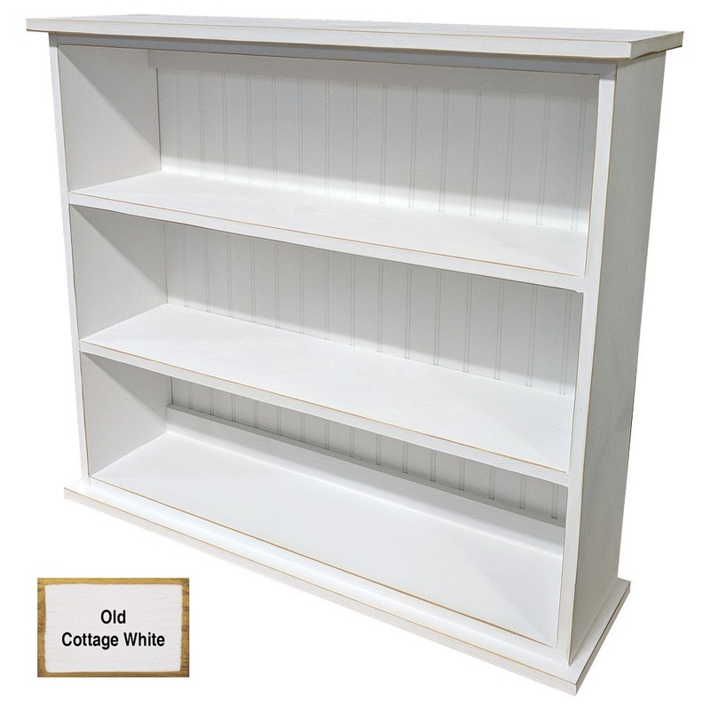 Solid pine 3 feet wide 3 shelf bookcase with beadboard back. Features: -Handmade from solid knotty pine -Modest and rustic in the tradition of cottage style furniture -Overall dimensions: 36" W x 10" D x 32" H -3 openings allow for 33"W x 8.5"D x 9"H -Mino