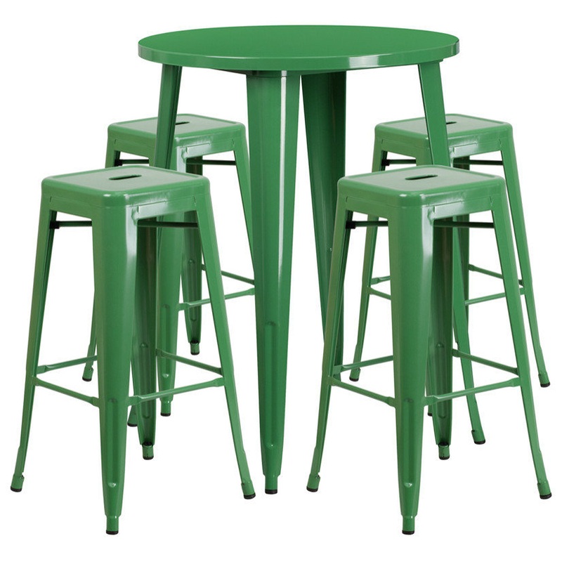 Complete your dining room, restaurant or patio with this chic bar table and chair set. This colorful set will add a retro-modern look to your home or eatery. Table features a smooth top and protective rubber floor glides. The stackable barstools feature plastic caps that prevent the finish from scratching while being stacked. This 5 piece table set is designed for indoor and outdoor settings. For longevity, care should be taken to protect from long periods of wet weather. The possibilities are endless with the multitude of environments in which you can use this table, for both commercial and residential spaces. [CH-51090BH-4-30SQST-GN-GG]