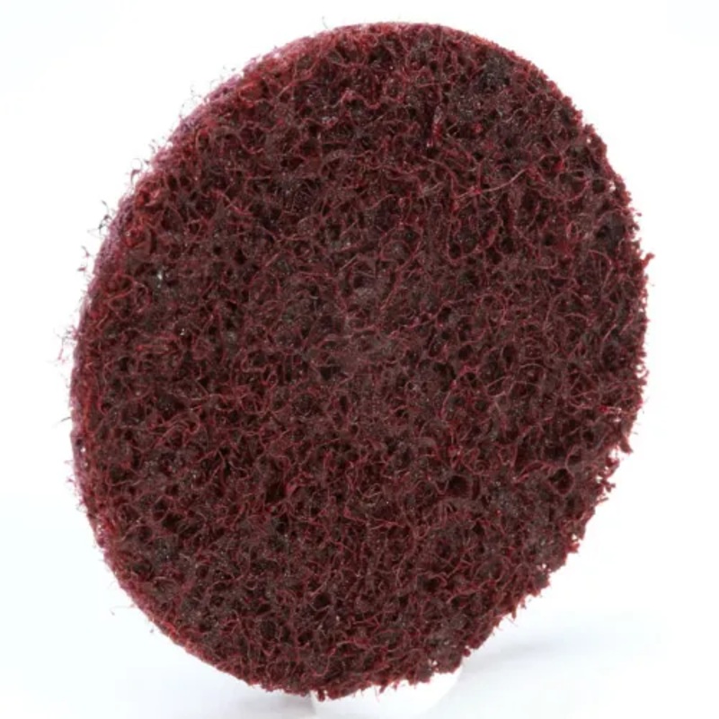 The open-web fiber runs cool and resists loading while the abrasives provide a high cut-rate to give you consistent finishing. The 3M Roloc attachment system offers quick and easy disc change-out, making the Scotch-Brite Roloc Surface Conditioning Disc ideal for a range of tasks including blending, deburring, and finishing. The Scotch-Brite Roloc SC Surface Conditioning Disc is available with a choice of silicon carbide or aluminum oxide abrasive mineral. Silicon carbide is a synthetic mineral that is very sharp and commonly used for low-pressure applications such as paint prep and finishing. Aluminum oxide is a hard, blocky mineral that provides high cut-rate and long life. While silicon carbide breaks down faster than aluminum oxide, it produces a finer finish. 3M Roloc quick change discs are smaller discs that easily and quickly attach onto a Roloc disc pad (sold separately) so that you can conveniently change discs from job to job or in multi-step finishing processes. The 3M Roloc Quick Change Attachment System provides a secure attachment even for heavy-duty applications, and the variety of available Roloc discs allows swapping from one application to the next in seconds. Each disc is also color-coded to identify its grade, making it easy to grab the grade required for different applications. Scotch-Brite surface conditioning products have been developed by 3M with abrasives incorporated into non-woven nylon or synthetic fibers. Combining abrasives with the fibers creates an abrasive system that delivers consistent results for the life of the product. The open-web material runs cool, reducing the risk of part discoloration and warping. The fibers are load resistant and keep the abrasive minerals cutting at high performance by limiting clogging of the fibers, which also extends the life of the disc.