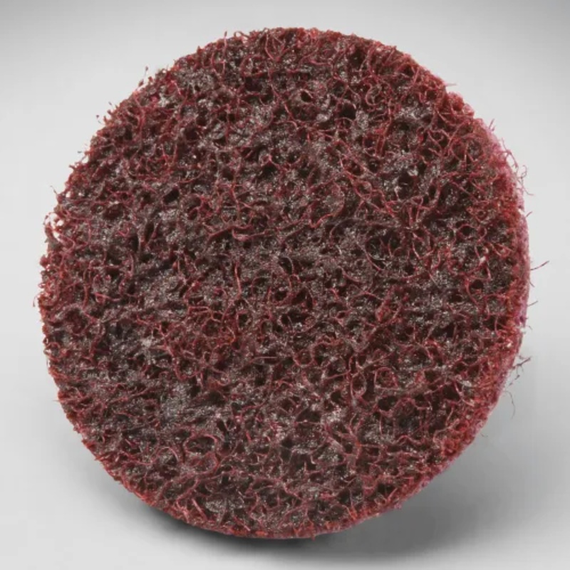The open-web fiber runs cool and resists loading while the abrasives provide a high cut-rate to give you consistent finishing. The 3M Roloc attachment system offers quick and easy disc change-out, making the Scotch-Brite Roloc Surface Conditioning Disc ideal for a range of tasks including blending, deburring, and finishing. The Scotch-Brite Roloc SC Surface Conditioning Disc is available with a choice of silicon carbide or aluminum oxide abrasive mineral. Silicon carbide is a synthetic mineral that is very sharp and commonly used for low-pressure applications such as paint prep and finishing. Aluminum oxide is a hard, blocky mineral that provides high cut-rate and long life. While silicon carbide breaks down faster than aluminum oxide, it produces a finer finish. 3M Roloc quick change discs are smaller discs that easily and quickly attach onto a Roloc disc pad (sold separately) so that you can conveniently change discs from job to job or in multi-step finishing processes. The 3M Roloc Quick Change Attachment System provides a secure attachment even for heavy-duty applications, and the variety of available Roloc discs allows swapping from one application to the next in seconds. Each disc is also color-coded to identify its grade, making it easy to grab the grade required for different applications. Scotch-Brite surface conditioning products have been developed by 3M with abrasives incorporated into non-woven nylon or synthetic fibers. Combining abrasives with the fibers creates an abrasive system that delivers consistent results for the life of the product. The open-web material runs cool, reducing the risk of part discoloration and warping. The fibers are load resistant and keep the abrasive minerals cutting at high performance by limiting clogging of the fibers, which also extends the life of the disc.