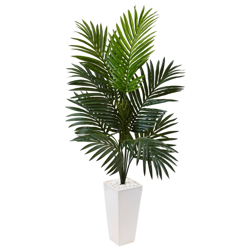 Bring a calm, relaxing tropical feel to any room or area with this faux kentia palm tree. Bursting up out of a white tower base, this faux kentia palm is a perfect addition to a reception or lobby area. White decorative rocks are included to complete the look.
