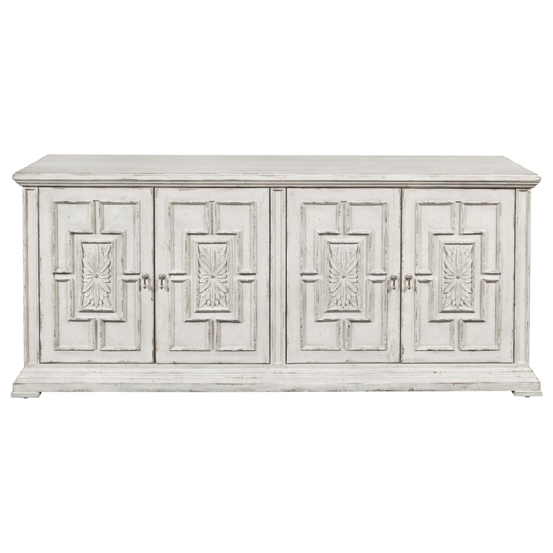 Exquisitely designed, this 4 Door Entertainment Credenza exhibits classic moldings with an inviting aesthetic. This multifunctional piece features a rosette carving design on the door fronts with an updated rub-through white finish, pendant-style door pull