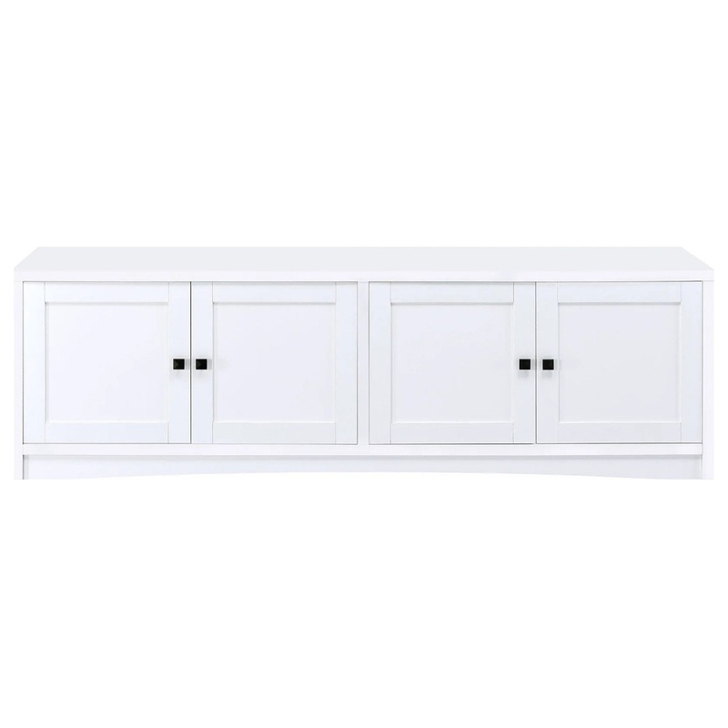 Create plenty of storage to accompany your large-screen television with this modern TV stand. Designed to host a TV up to 80 inches, it's a long, linear structure with clean, precise lines that blend into most spaces. Four doors open to reveal interior she