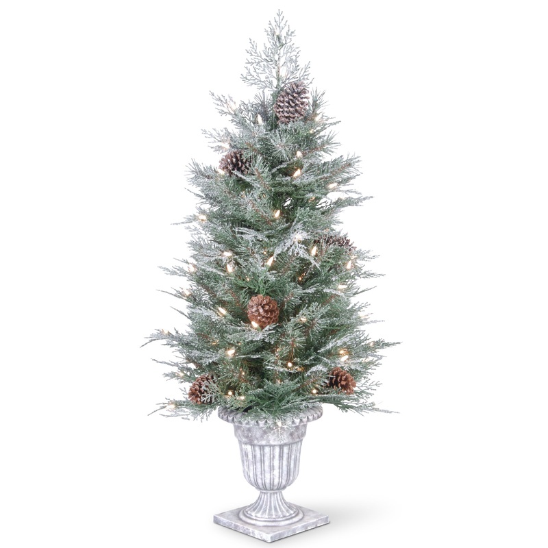 The Frosted Mountain Spruce Entrance Tree features Feel Real branch tip technology, ensuring stunning realism with its crush-resistant branch tips molded from actual tree branches. This mixed-tip design combines lush greenery with a frosted finish, creating an inviting and festive look. It is pre-lit with 100 clear lights that remin lit even if a bulb burns out. Trimmed with pine cones and seated in a pedestal urn base, this entrance tree is perfect for welcoming guests during the holiday season. Fo rindoor or outdoor display.