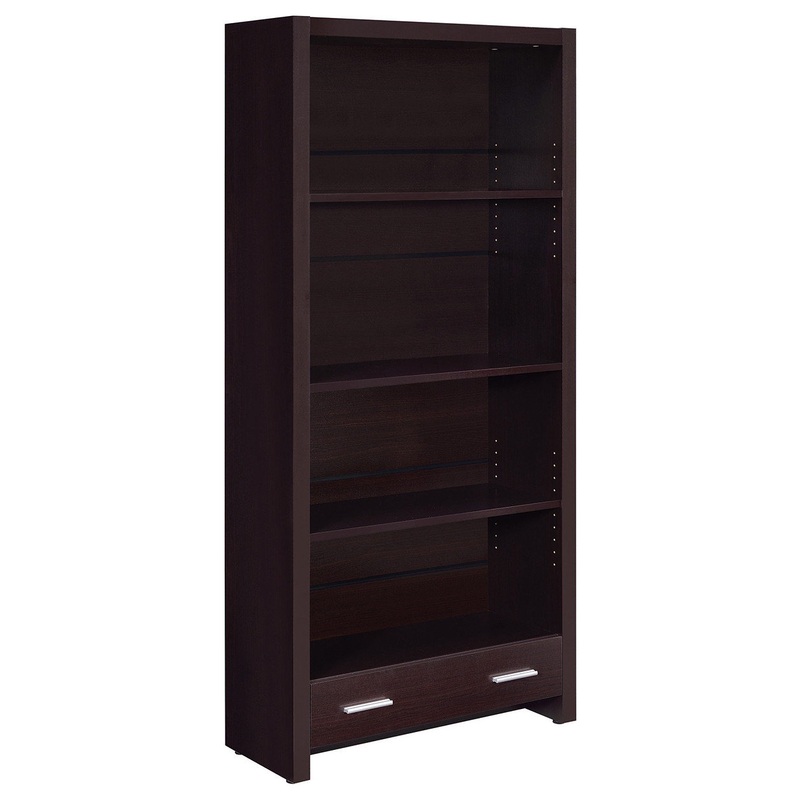 Smooth and clean-lined, this bookcase offers transitional style in office or study room. A sophisticated cappuccino finish covers the bookcase. Four shelves offer ample open storage for holding your office supplies. An hidden storage space offering can be found in the single drawer which has smooth-operating metal glides at the bottom of the bookcase. With contemporary, silver drawer pulls, this drawer is a great place to store paper or other small office items.