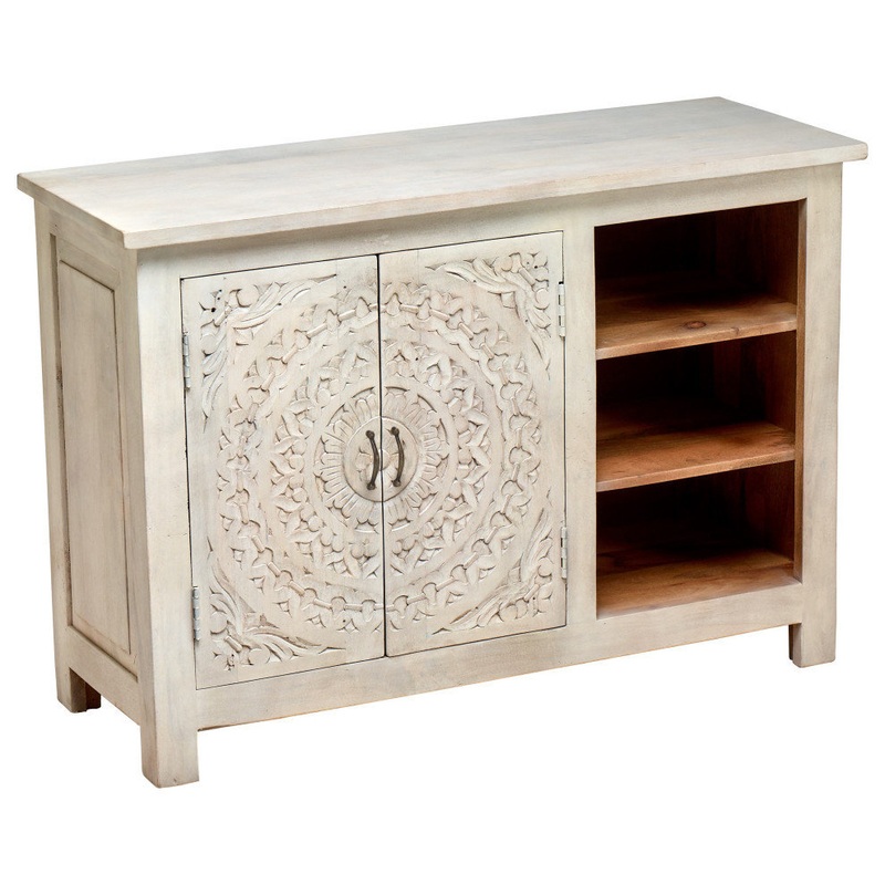 -Distressed Antique White Hand Carved TV Stand Media ConsoleThis distressed whitewashed hand carved bohemian collection is constructed, using panel-based methods, of mango timber in a water-resistant lacquer sealed whitewash finish. This impressive hand carved mango wood tv cabinet features a notched base with molding detail, framed carved door panels, simple antique brass finished knobs, and three ample shelved compartments. This distressed whitewashed sideboard’s doors have intricately carved panels and open to spacious shelved interiors, accented with dark metal hardware for a touch of contrast. Ample storage space for you to enjoy the beauty of your new-found treasure. The unmistakable look of hand-shaped wood showcases the high level of craftsmanship that makes every piece unique. This sideboard arrives fully assembled and is made from solid mango wood with intricate hand-carved patterns along with the three spacious drawers and cabinets adding bold visual texture. This beautifully sophisticated showpiece is a great addition to any room in your home.