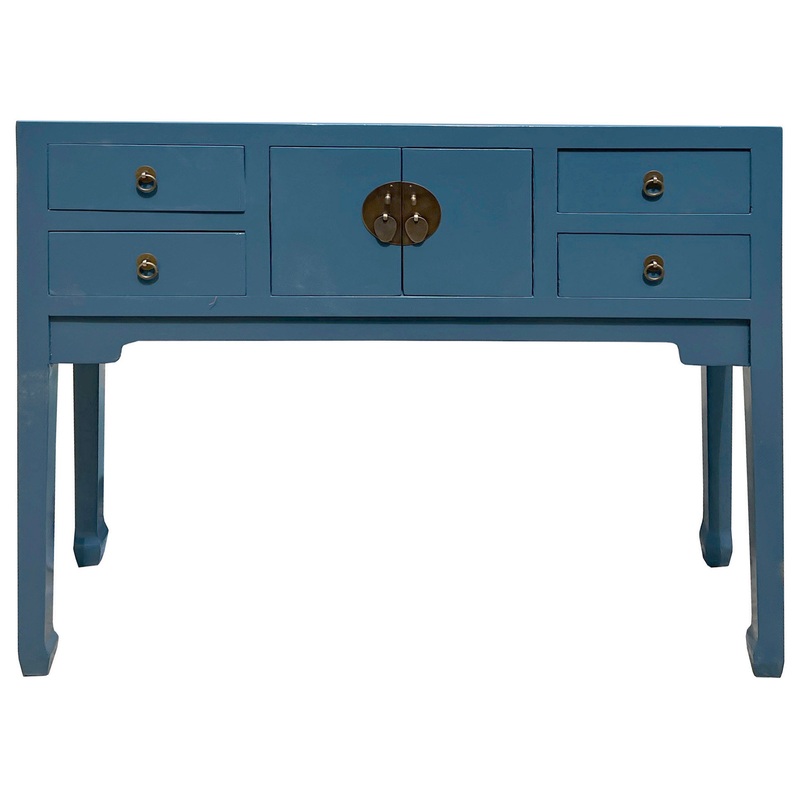 This is a simple pastel venice blue #35607A lacquer slim narrow console side table with a straight-leg design. Drawers are decorated with Asian-style handles. -Dimensions: w47"x d14"x h34" , underneath height 20" -Origin: China -Material: Wood -Condition:
