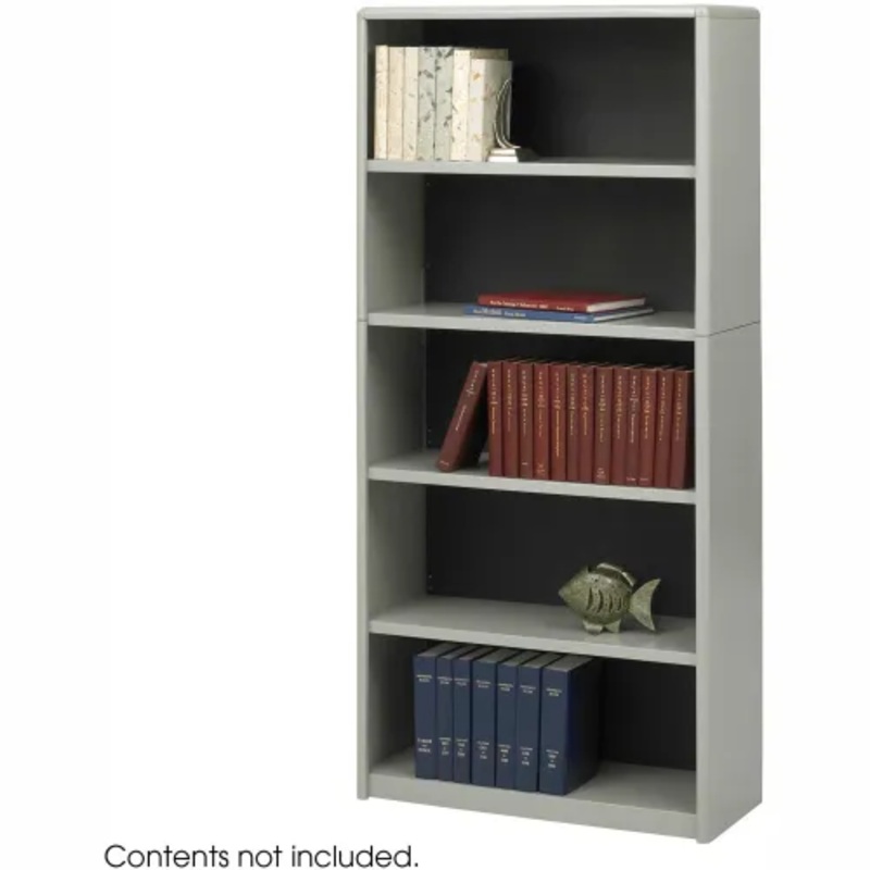 The 5 Shelf ValueMate Economy Bookcase is a Gray workspace organizer with steel-constructed shelves and exterior. With a fiberboard backing, the bookshelf offers 12" deep bookshelves that can adjust in 1" increments during assembly. Plastic, snap-in radius