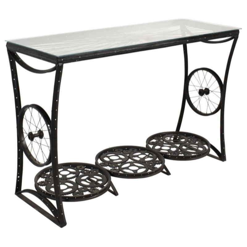 -53" Unique Repurposed Bicycle Parts Slim Console Table With StorageThis unique modern repurposed bicycle parts console table with storage is carefully crafted using a combination of bicycle parts, cast iron and glass including corrugated sheeting in a gal