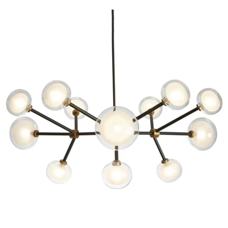 50s inspired collection of elegant and sophisticated lamps representing the detail to enrich any location. A double-sided spherical bright object in borosilicate glass makes these lamps available in different compositions and a structure made by metal coated with epoxy powder enriched with brushed brass details. Different varieties are available for any situation: chandelier or table lamp, bedside (smaller), floor or wall (available in two sizes for single or composite personalized installation). Richness and sobriety all in one single element.