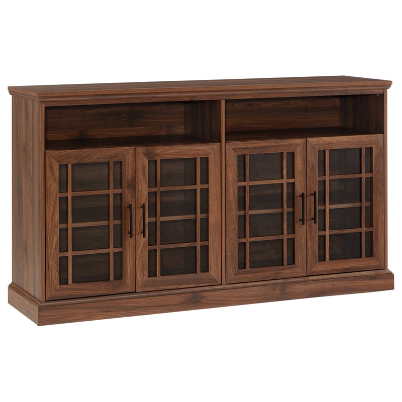 With all the flair of a traditional English manor, this sideboard maintains a stately presence without getting stuffy. This storage console can be used as a kitchen credenza where you can keep your cookbooks or party dishes or it can be used as a TV stand. This buffet boasts a timeless fretwork pattern on the four front glass doors along with other features such as: cord management options, soft close hinges, and adjustable shelves. This stand accommodates TVs up to 64-inches.