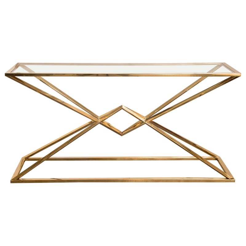 -Gold Console Table with Top Tempered Glass Features Summary:Color: Gold 1. Artisan Quality Polished Stainless Steel Base in Gold Finish 2. Clear, Tempered Glass Top 3. Crisp, Clean Streamlined Design for Modern Living 4. Complete Collection Includes: Cocktail, End & Console 5. 8mm Glass Top Dimensions: 59 x 18 x 29 Designed and manufactured by Diamond Sofa.
