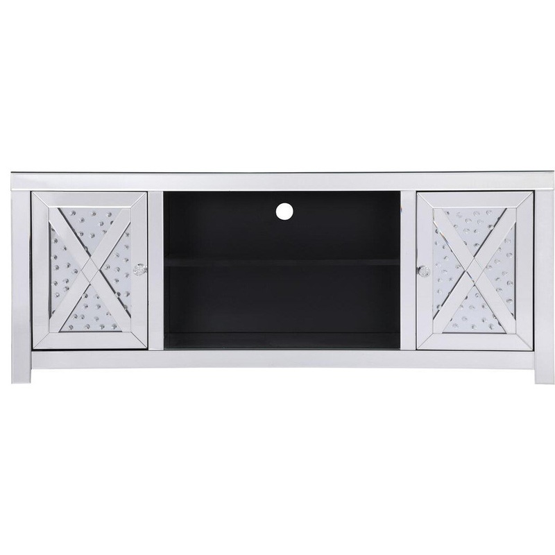This mirror paneled tv stand is the perfect complement to your entertainment spaces. You can enjoy watching endless movies, host premier nights, or play video games until the stars are sparkling just as bright as the clear crystals that embellish the panels within the X-shaped details of the cabinet doors, which opens to reveal a storage area that is the perfect place to put away board games and various trinkets. Video game consoles and players can find a cozy spot in the middle storage area, or you can place books to read for when the tv is off. The perfect home for your tv, movies, and board games, this stand combines sparkling beauty with function.Available at AppliancesConnection Features: convenient precut 2 inch hole for cable/wires management features shelves for extra storage organization surface top can hold up to 66 lbs stainless steel metal knob fully assembled top surface is mirrored clear crystal inlay