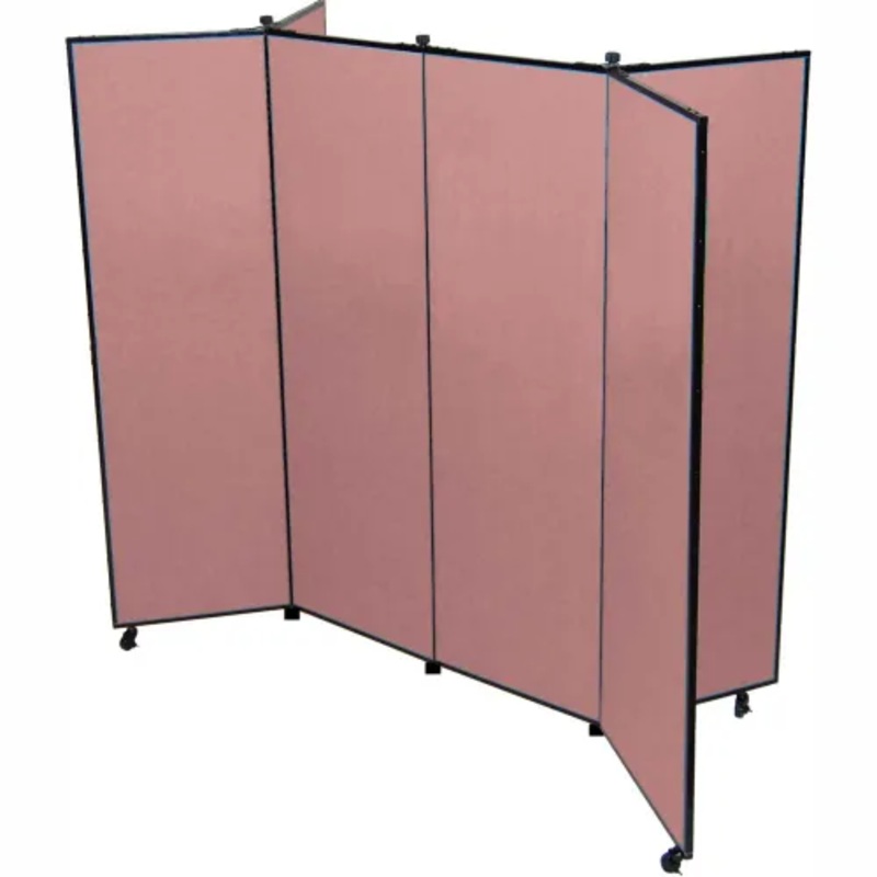 Simply move, unlock and unfold partition to provide a full, extra large display area for various environments. Accepts push pins, tacks, staples and more with ease (not included). Made using 76% recycled material. This partition features sound absorbing fabric upholstery that provides a tackable surface. The panels are finished with 20 gauge powder coated steel trim covering 26 gauge galvanized steel framing. Panels are constructed of 1/2″ closed cell honeycomb core with non-woven fiberglass facing and matte. Panels are joined with full length piano hinges and position control pivot-point hinges that allow panels to be placed up to 180 degrees for various configurations. For mobility, this portable partition includes self-leveling, non-marring rubber casters and locking end casters for stationary positioning. Fully assembled. 6 Panel Unit. 72″W x 69″H Overall. Rose Finish.