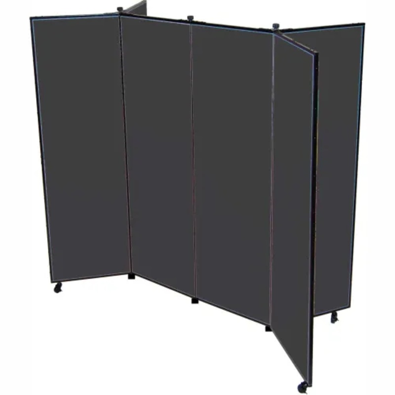 Simply move, unlock and unfold partition to provide a full, extra large display area for various environments. Accepts push pins, tacks, staples and more with ease (not included). Made using 76% recycled material. This partition features sound absorbing fabric upholstery that provides a tackable surface. The panels are finished with 20 gauge powder coated steel trim covering 26 gauge galvanized steel framing. Panels are constructed of 1/2″ closed cell honeycomb core with non-woven fiberglass facing and matte. Panels are joined with full length piano hinges and position control pivot-point hinges that allow panels to be placed up to 180 degrees for various configurations. For mobility, this portable partition includes self-leveling, non-marring rubber casters and locking end casters for stationary positioning. Fully assembled. 6 Panel Unit. 72″W x 77″H Overall. Black Finish.