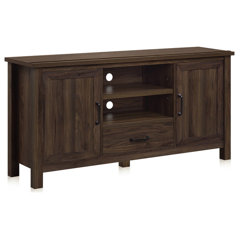 This versatile TV stand offers a classic farmhouse feel while providing a modern-meets-traditional addition to any room of the home. This media cabinet can accommodate TVs up to 65 inches and also provides plentify storage options. With both open shelves a