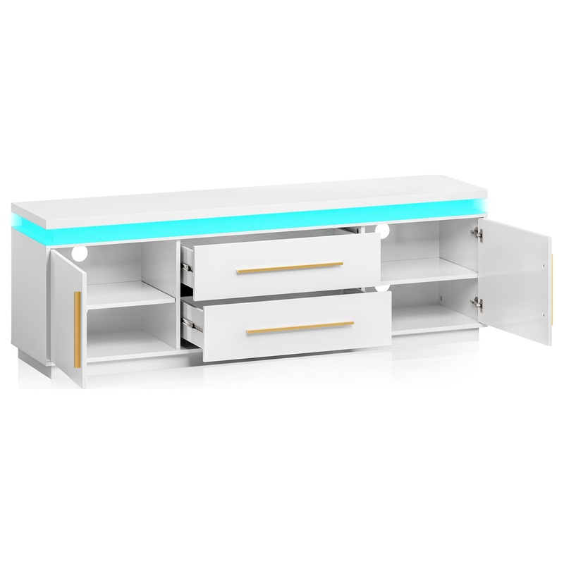 -[LED Lights] – The RGB LED lights built into this media cabinet modern tv stand provide a myriad of options including 16 different colors, 8 dynamic modes, 10 brightness levels, and 10 speed modes. The lights also automatically change to the sounds of music with a sync function that reacts to rhythms and melodies. With the incredible possibilities from these combinations, you’ll be able to set up any mood, ambiance, or atmosphere that you desire.