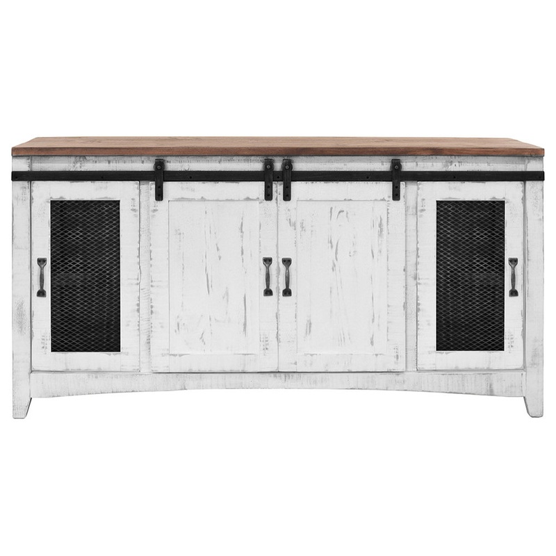 Make a true home theater of your room with this captivating 68" white solid wood cabinet enclosed storage distressed tv stand. Curated from a mix of high quality solid pine wood and durable manufactured wood, this console is beautiful, and built to last. D