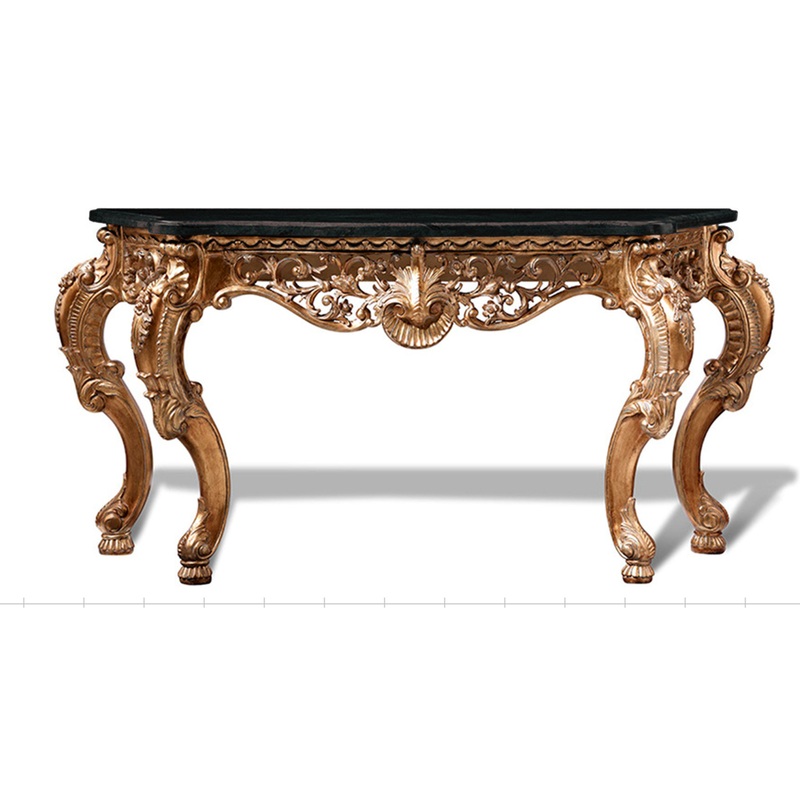 -Luxurious antique gold color console table. -Features black marble top and intricate floral design throughout. -Has beautiful hand carvings which exude elegance.From the entryway wall to the back of a living room sofa to the empty spaces in between, the R