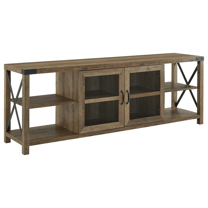 Find the ideal entertainment unit at the intersection between style and functionality with this metal x 70-inch TV console. Putting an industrial spin on the farmhouse design trend this media console features open and closed storage that’s framed with exposed metal accents on the sides and top corners of the piece. Behind the tempered glass front doors with soft close hinges are adjustable shelves. The side shelves are fixed. This media stand features cord management options and can accommodate TVs up to 78-inches.