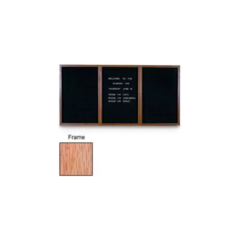 72" x 36" 3-Door Indoor Wood Enclosed Letter Board with Light Oak FrameThis Indoor Enclosed Letterboard is constructed of a solid oak frame. Black felt letterboard interior. 290 piece Helvetica letter set included. Shatter-resistant acrylic window. Doors h