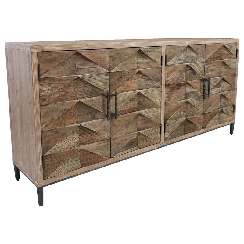 The Maverick sideboard creates a striking effect in your space with this cleverly designed sideboard featuring unexpected dimension and texture. Made of reclaimed pine wood and iron base. Fixed interior shelves and distressed, rustic finish. -76w 17d 36h -