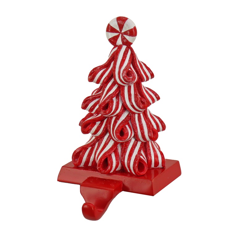 Hang your stocking so that Santa can see it with this unique holiday hanger. An evergreen tree is sculpted from swirling loops of striped candy that sits atop a thick base with large hanging hook. This dcor piece is constructed with a combination of dura