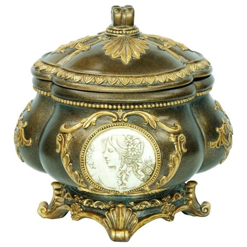 -This item will add a majestic ambience to your roomThe jewelry box features archaic patterns of gold leaves on two of the four sides and Classical Greek engravings of female portrait on two of the four sides that accents between bronze and gold lacquer finished (base diameter 5.5″)