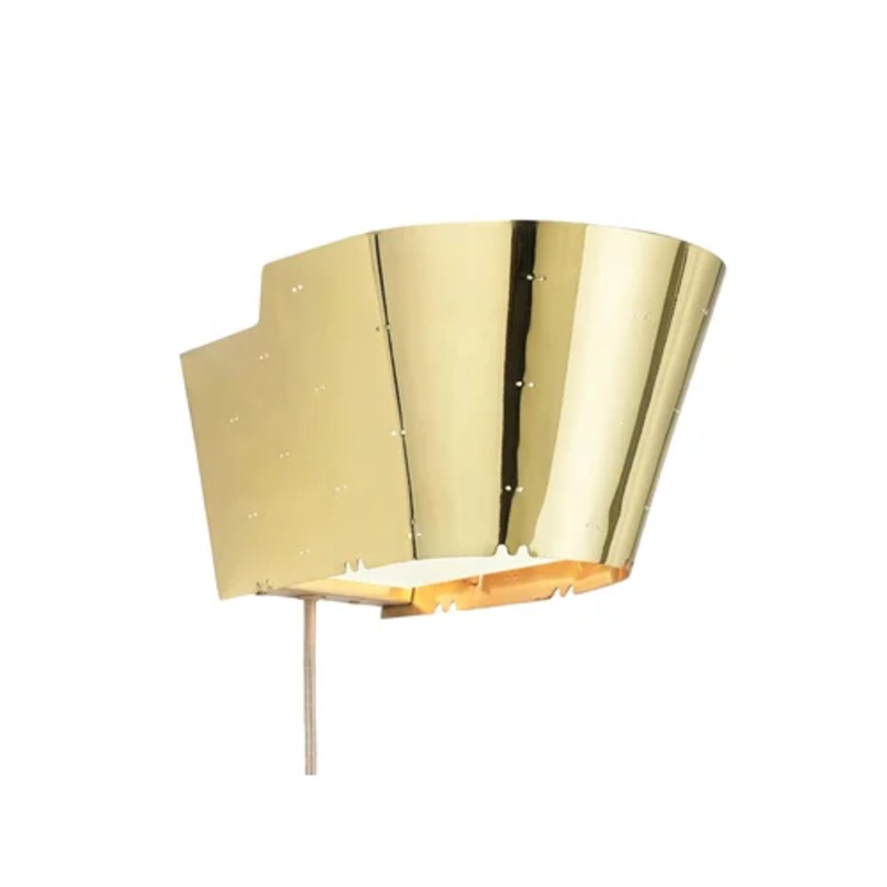 The lamp 9464 is a wall lamp designed by the designed Paavo Tynell and produced by the brand Gubi.The beautiful 9464 Wall Lamp, designed in 1947 by Paavo Tynell, is a great example on how the Finnish designer elevated illumination into an art form. The clean, sculptured brass shade lends an air of elegance with Tynells distinctive traits of twin dot perforation pattern combined with notched edges, making the wall lamp appealing and admirable in all its simplicity. Equally relevant today as when first introduced, the 9464 Wall Lamp fits perfectly into contemporary interiors, adding a sculptural effect to the wall whilst simultaneously creating a relaxed yet very refined indirect lighting.Light source: Max 46W-Halogen, E27 socket (light bulb not included) – 220v