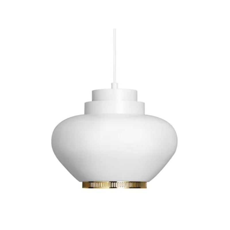 A333 Turnip is a suspension lamp designed by the famous designer and architect Alvar Alto and produced by the Artek brand. This lamp is manufactured in China. A333 features a shade made of white painted steel and a brass-plated steel ring.